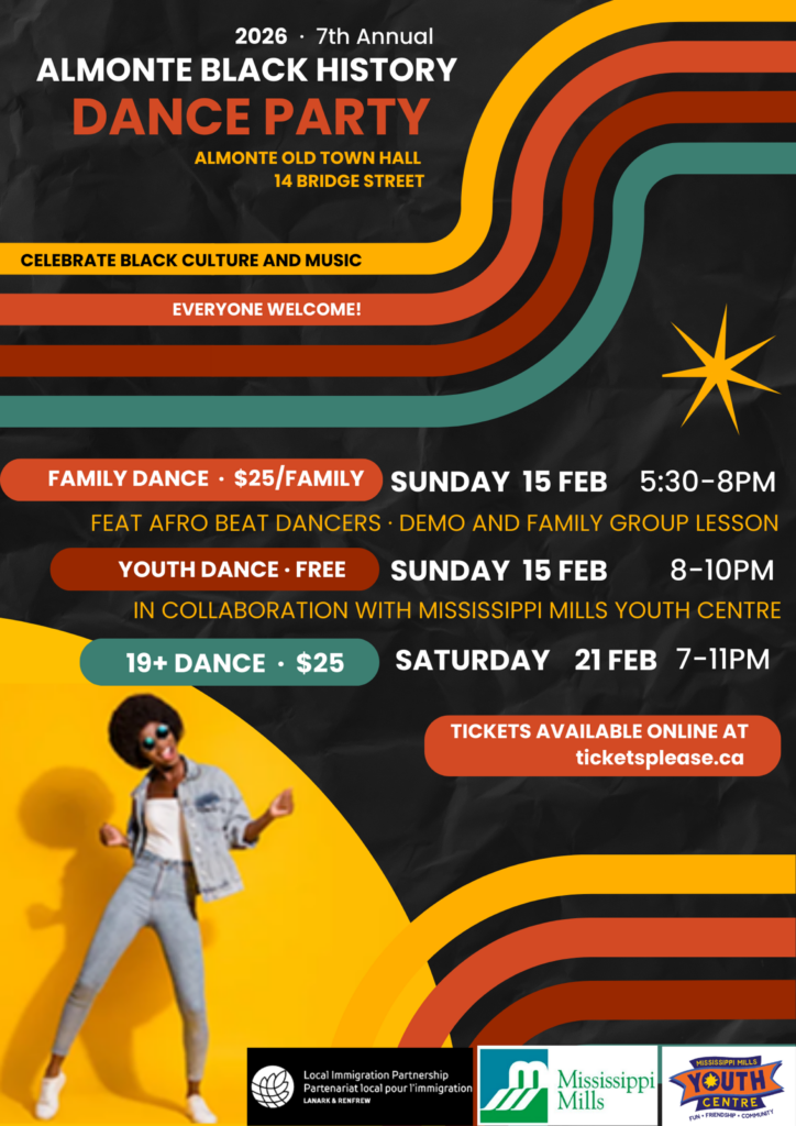 Black History Month Dance Party February 21, 2026 @ 7:00 pm Location: Almonte Old Town Hall Upcoming Dates Sat, Feb 21, 2026 @ 7:00 PM Address 14 Bridge St Almonte, Ontario K0A 1A0 Canada Venue Name Almonte Old Town Hall
